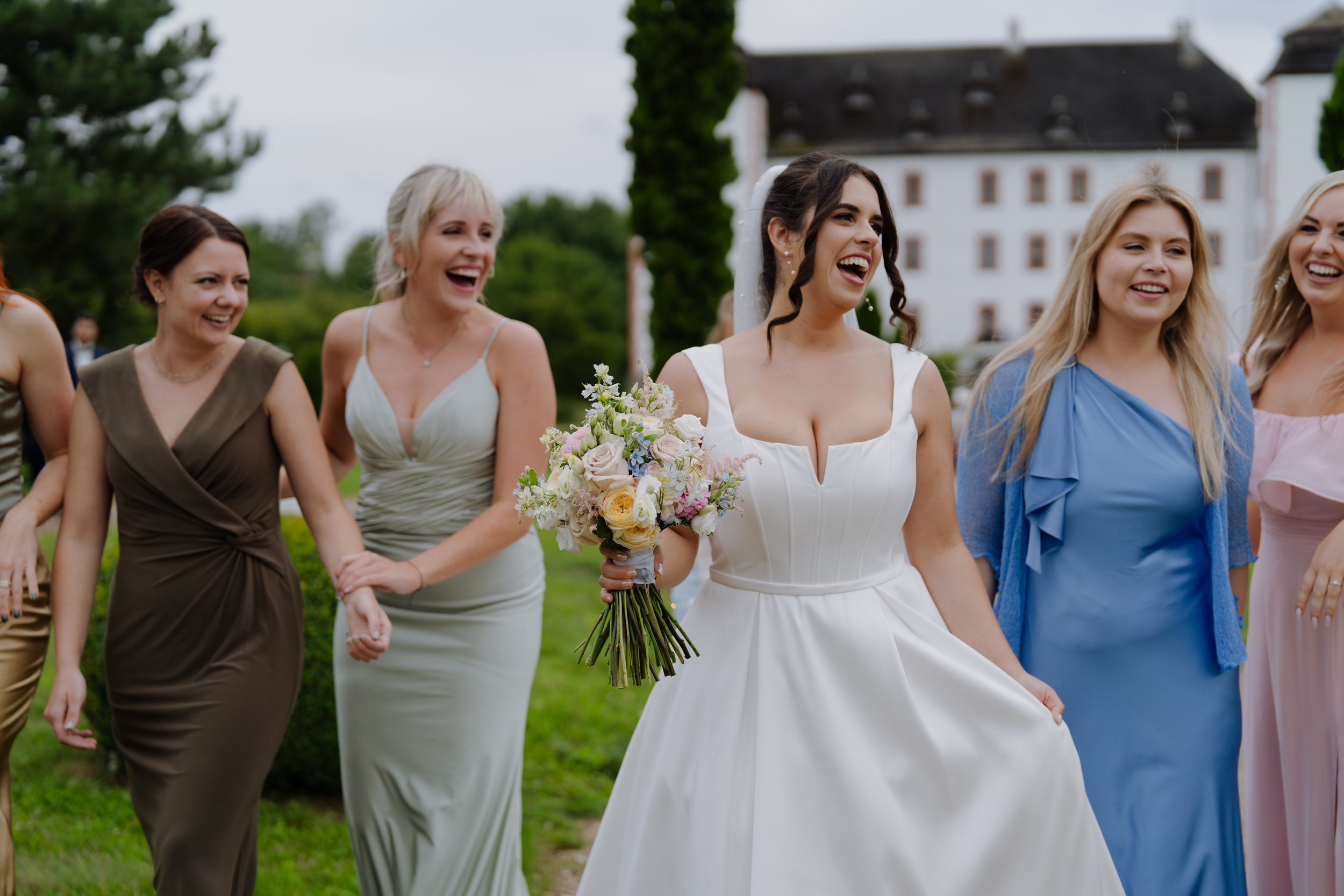 Die Braut mit ihrem pastellfarbenen Brautstrauß, von ihren Bridesmaids umgeben, deren Looks die Farbpalette harmonisch aufgreifen.