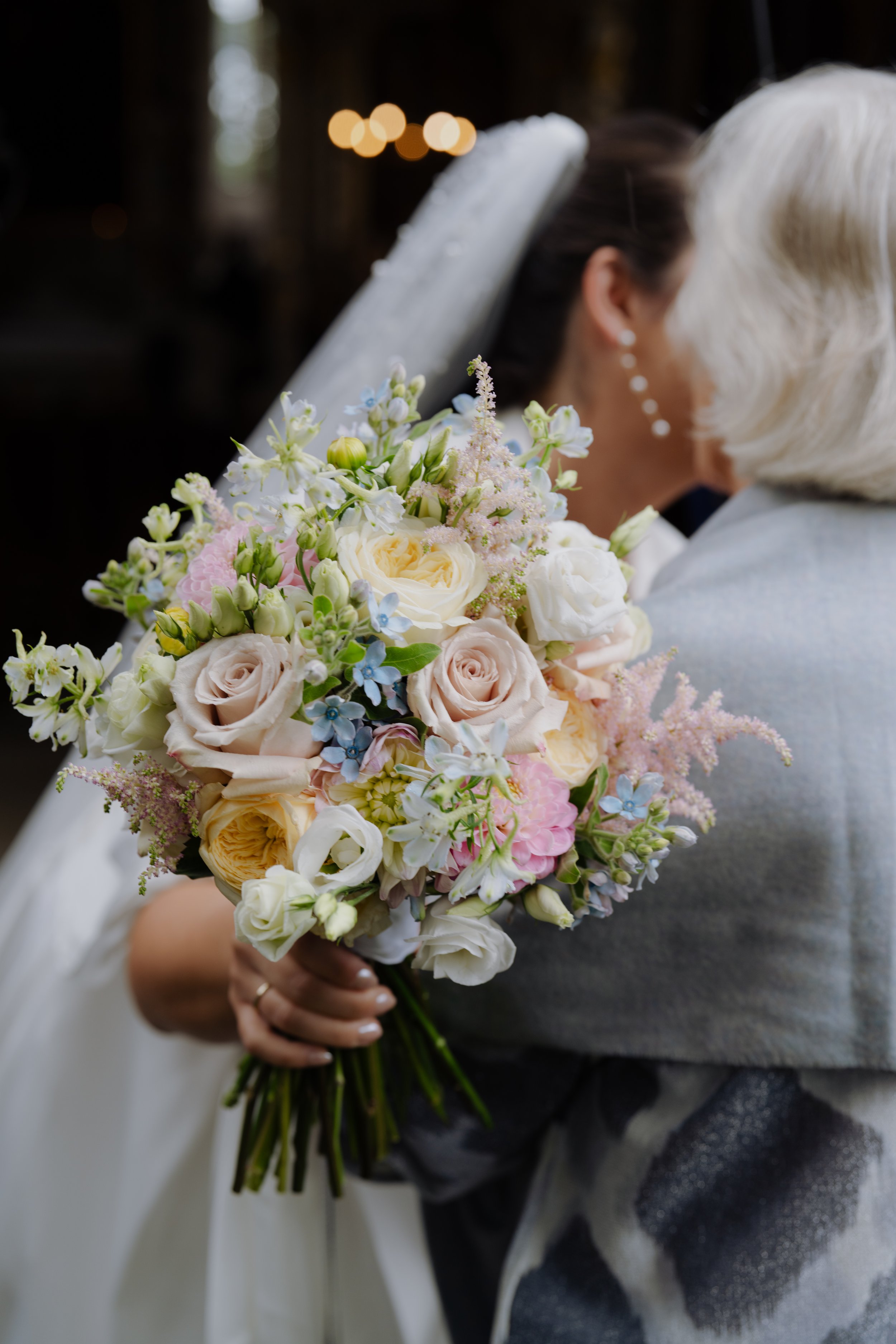 Ein kompakter, fülliger Brautstrauß in sanften Pastellnuancen: von Blau über Rosa und Blush bis hin zu Creme, Gelb und Flieder.